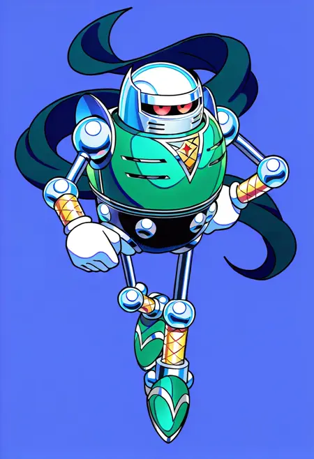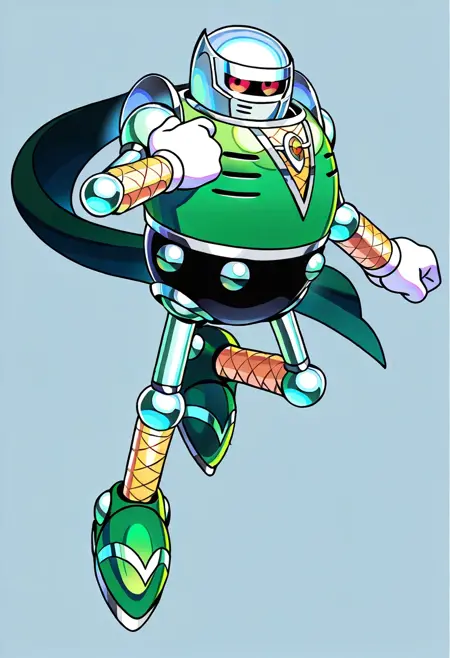 HeavyShinobi, 1boy, robo, mecha, fully egg-shaped humanoid robot, ninja, green haori, yellow-triangular cross-pattern chest piece, black bottom torso, red eyes, gray appendages, green zōri-like forefeet, dark green scarf,