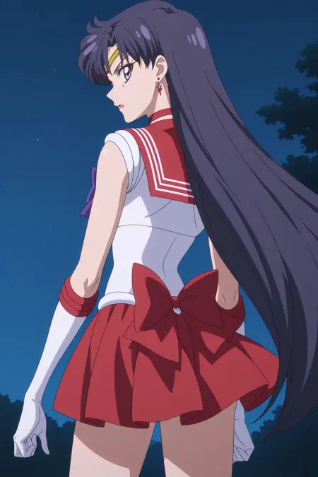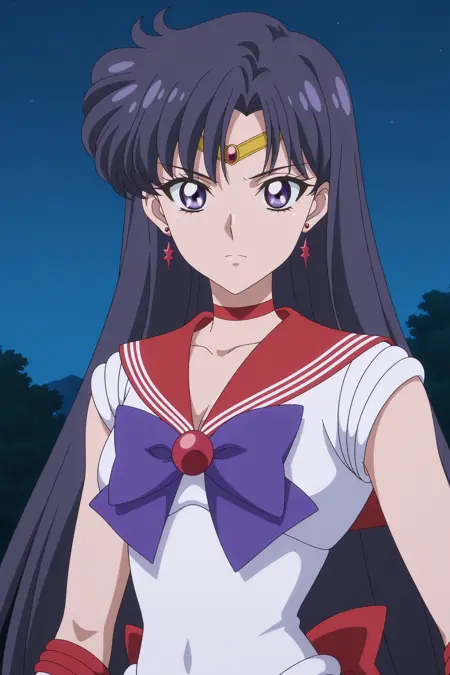 sailor mars,  long hair, purple hair, purple eyes, red earrings, floating earring, circlet, sailor senshi uniform, magical girl, red choker, red sailor collar, purple bow, white gloves, elbow gloves, red skirt, pleated skirt, red back bow, red footwear, high heels