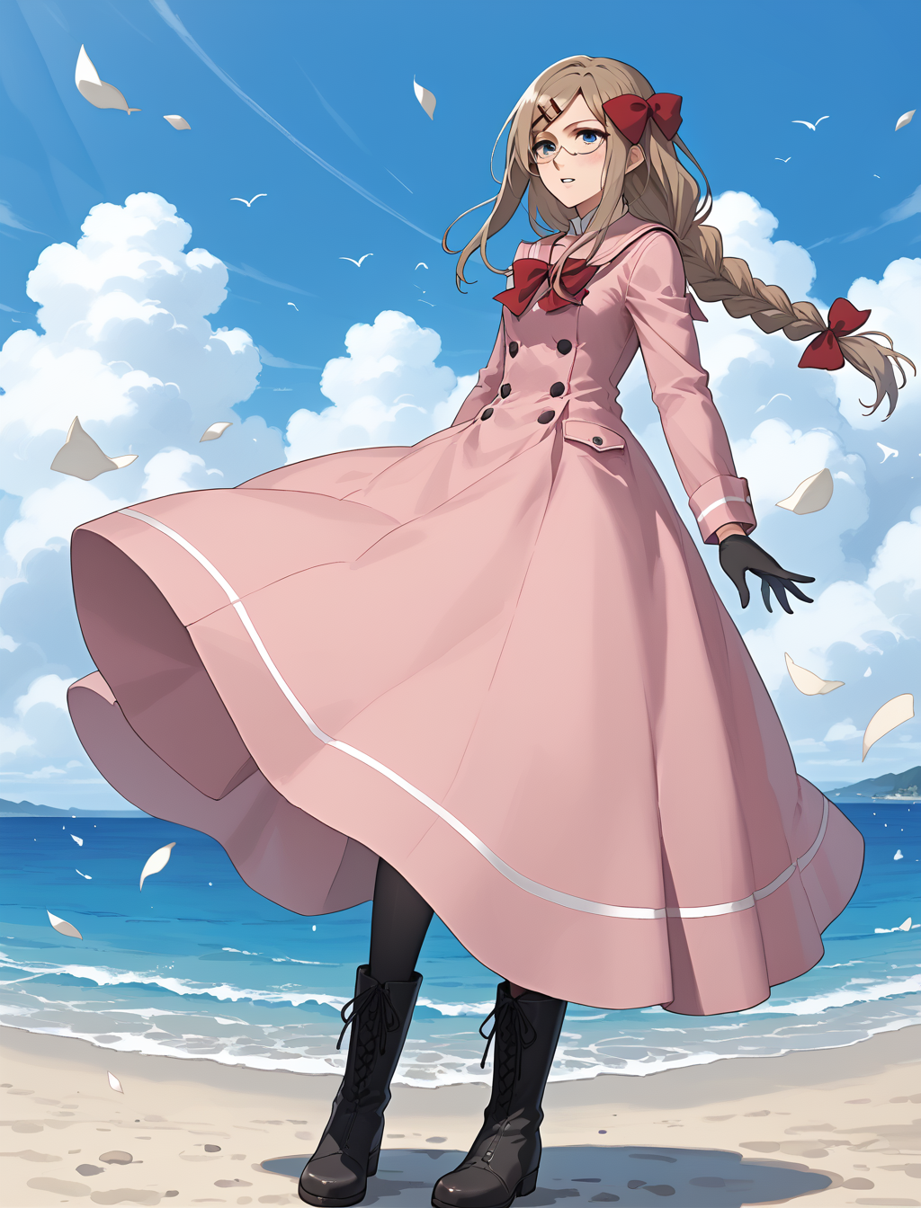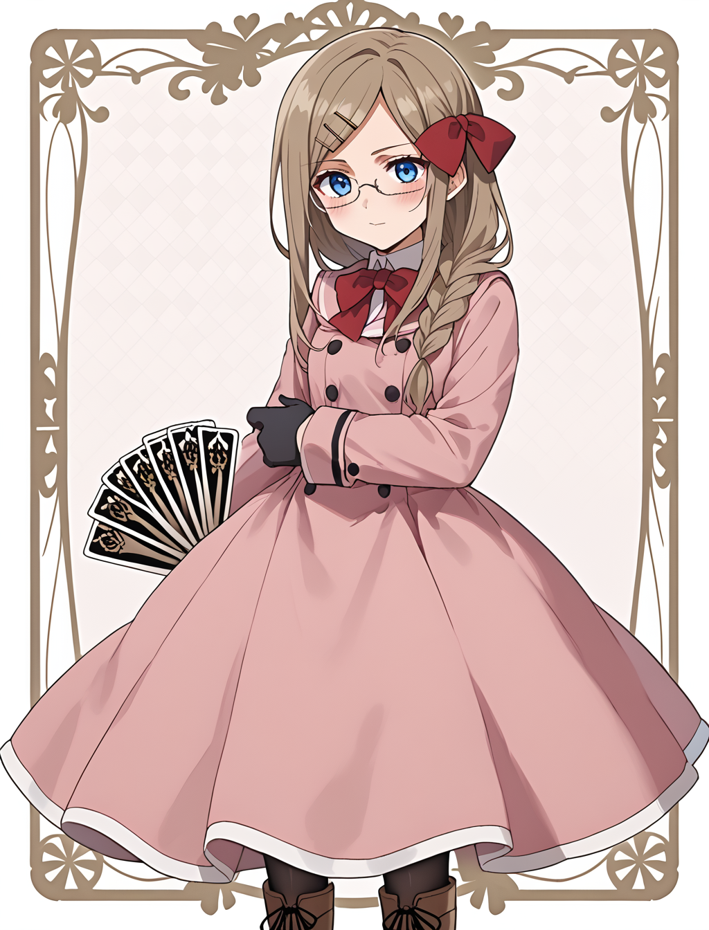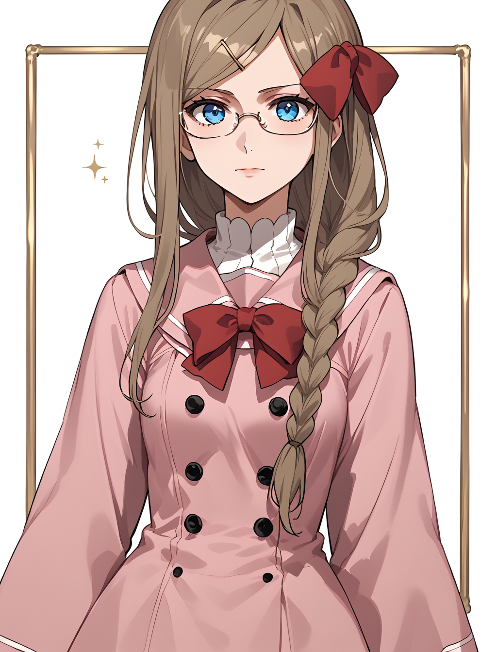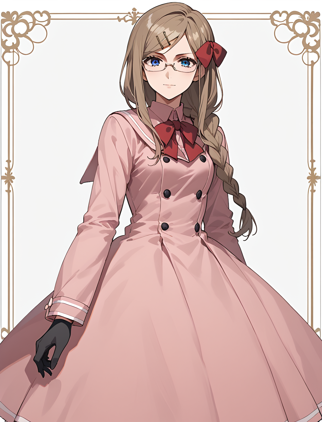 pink dress, hair bow, hair ornament, neckbow, sailor collar, black gloves, glasses, red bow