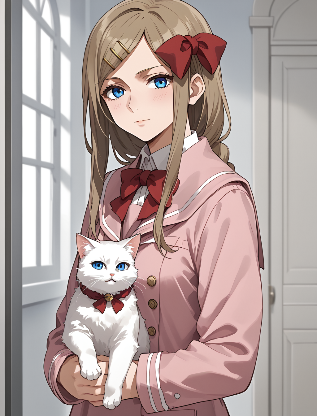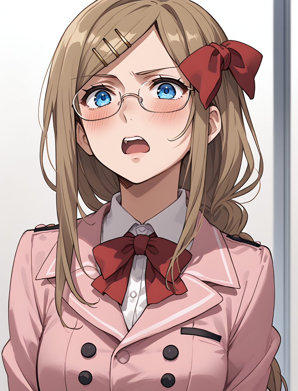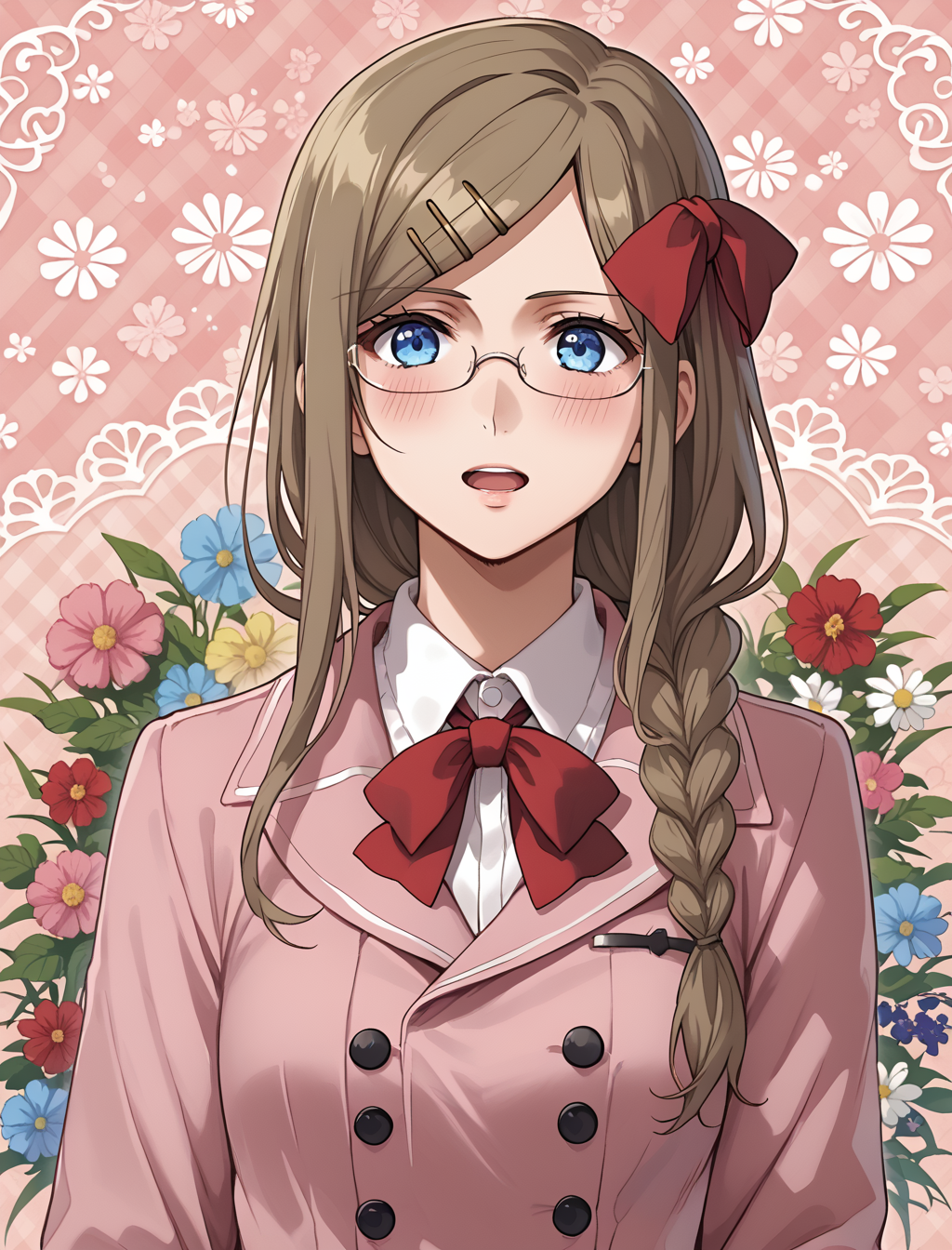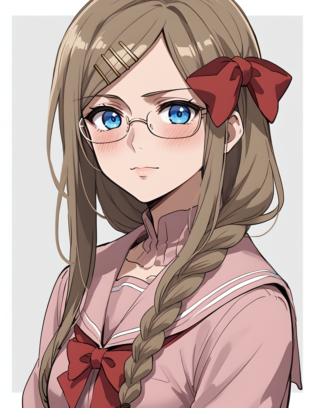 pink dress, hair bow, hair ornament, neckbow, sailor collar, black gloves, glasses, red bow