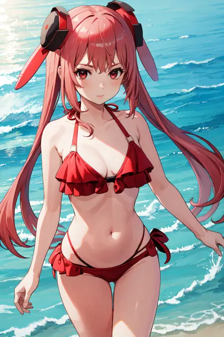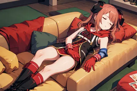생성 파라미터: 아라시, OSF 츄이 유니폼, 붉은 눈, 연한 분홍색 머리, 소매 없는 빨간 재킷, 낮춰진 후드, 검은 부츠, 빨간 발목 양말, 머리 장식, 팔찌, 빨간 장갑,