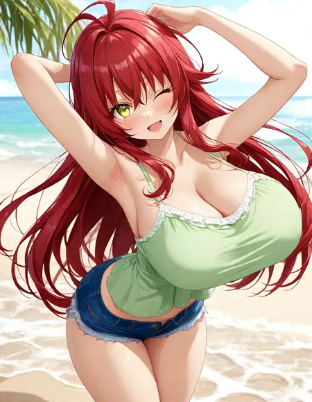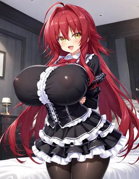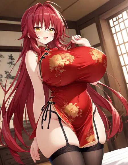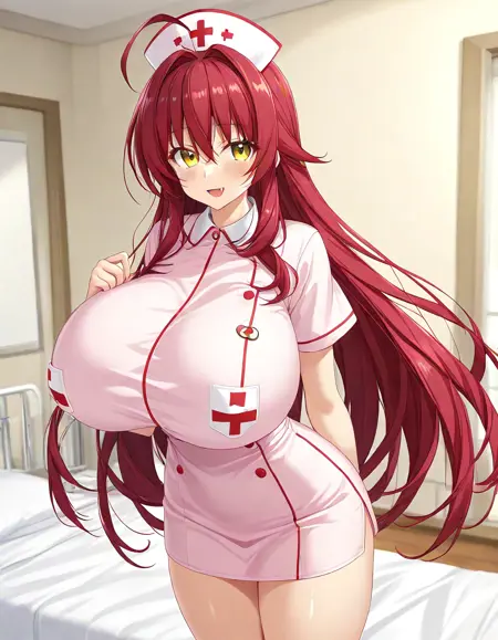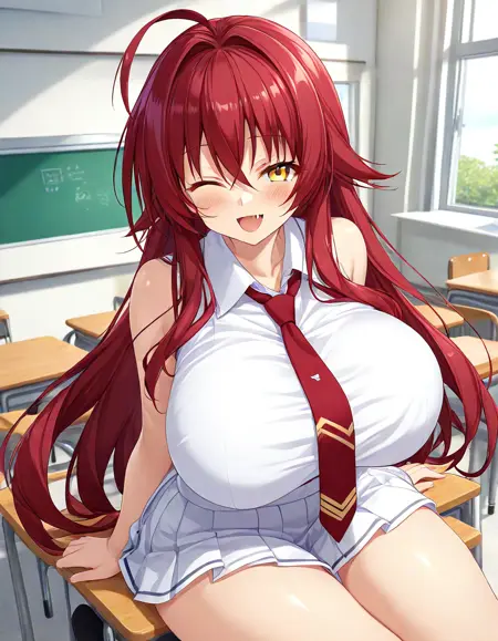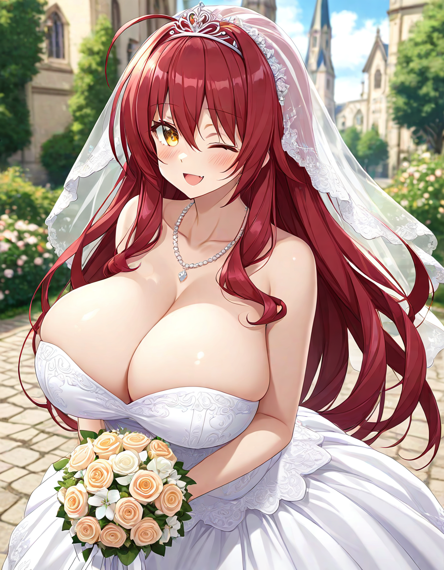 권장 프롬프트: Haruruko Mikogami, large breasts, yellow eyes, red hair, long hair, ahoge, fang,