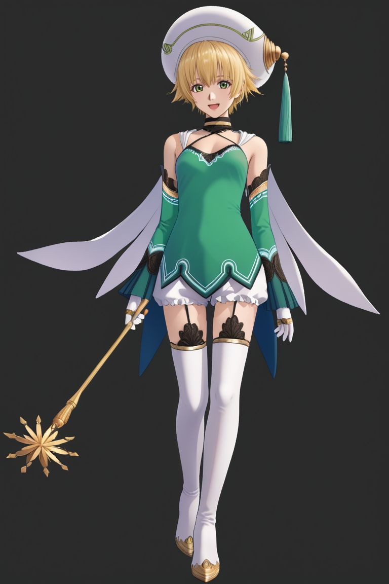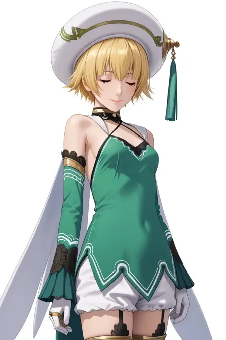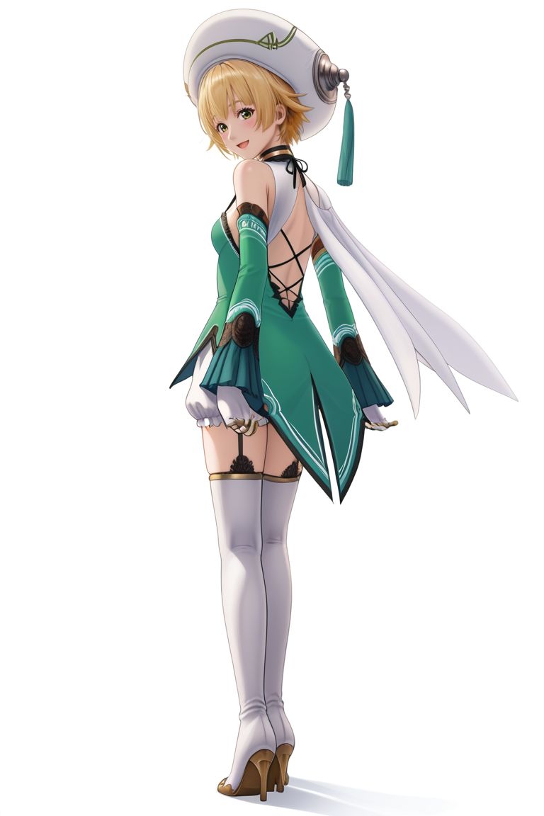 white headwear, hat tassel, detached sleeves, green dress, white gloves, laces, halterneck, bare shoulders, wing cape, white cape, bloomers, garter straps,