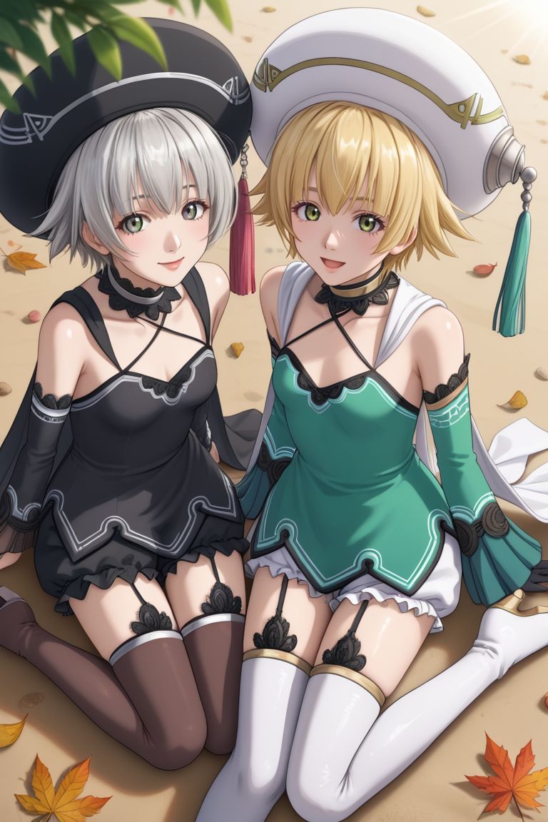 2girls, multiple girls, guatoli, blonde hair, green eyes, short hair, white head, white headwear, white hat, white cape, detached sleeves, green dress, white gloves, laces, hat tassel, halterneck, large hat, bare shoulders, thigh boots, wing cape, garter straps, high heels, bloomers,
