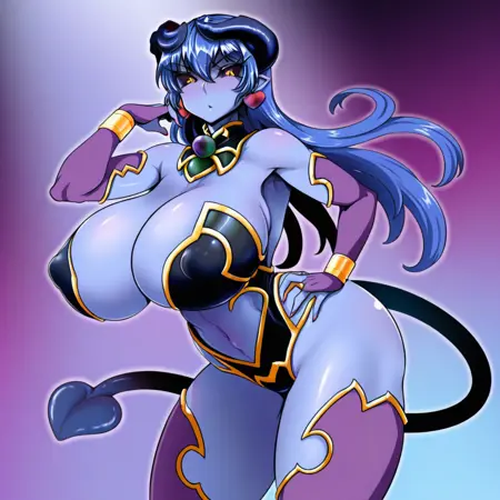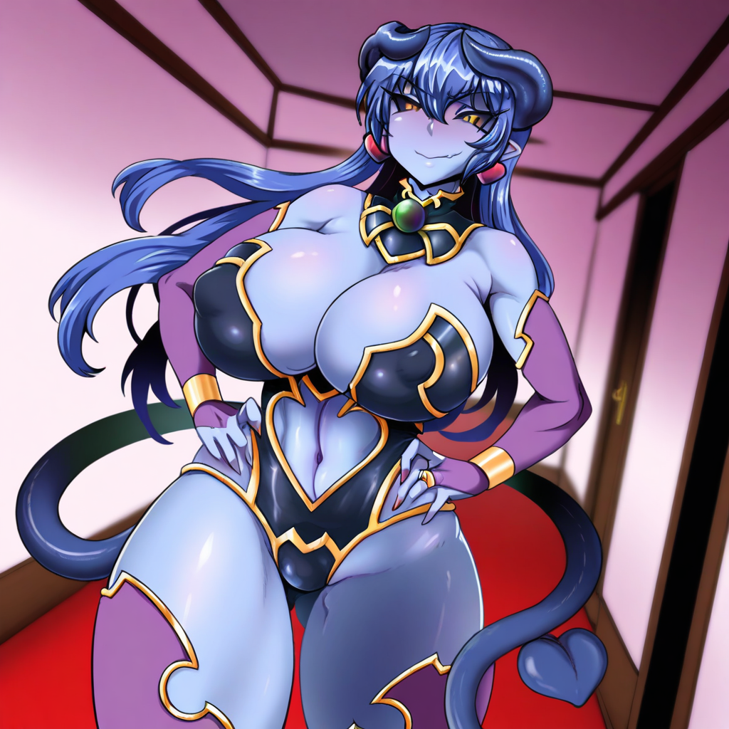 | 训练词汇 | shinrabanshou_astaroth,, 1girl, solo, breasts, black sclera, heart earrings, colored sclera, horns, covered nipples, pointy ears, bridal gauntlets, jewelry, tail, demon girl, earrings, huge breasts, colored skin, long hair, blue skin, navel, leotard, blue hair, demon tail, yellow eyes, heart, navel cutout, detached collar, thighhighs, demon horns, huge ass已复制! |