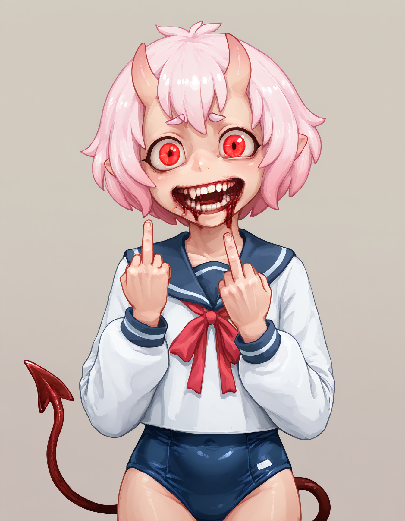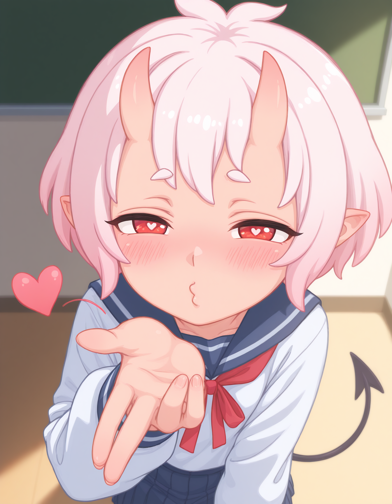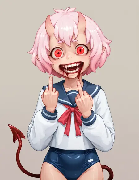 프롬프트: Oni-chan-vkstickrs, 짧은 분홍색 머리, 작은 뿔, 붉은 눈, 교복, 파란 치마, 빨간 리본, 긴 소매, 악마 꼬리.