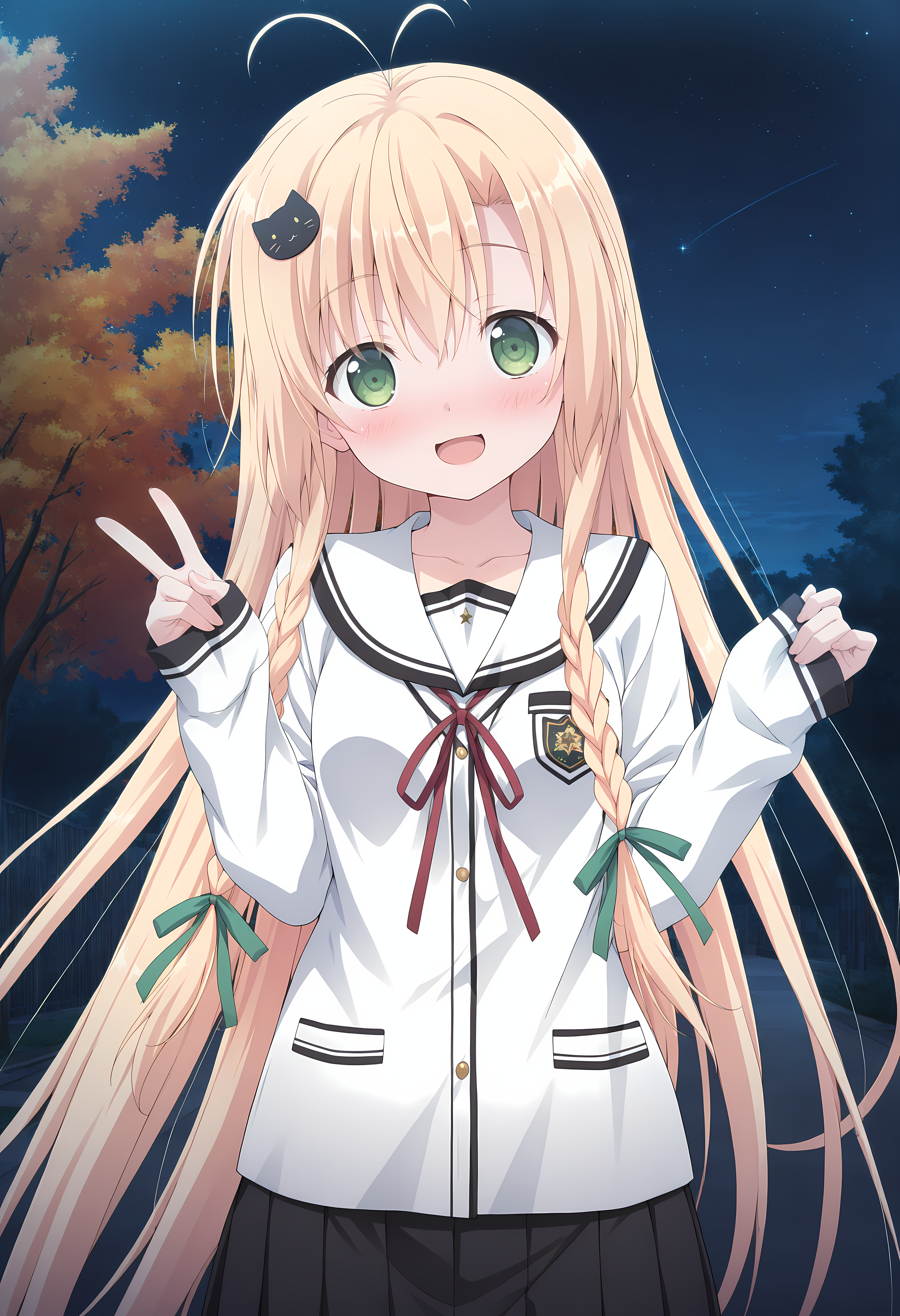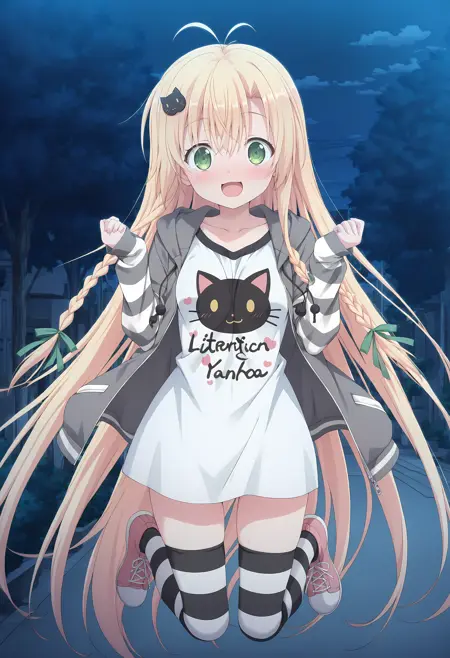 기본: 나노카, 금발, 매우 긴 머리, 녹색 눈, 작은 가슴, 머리 리본, 녹색 리본, 안테나 머리, 고양이 머리 장식, 쌍꼬리, 땋은 머리,