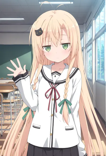 基础:南香,金发,超长发,绿眼睛,小胸,发带,绿色发带,天线发,猫发饰,双马尾,辫子,