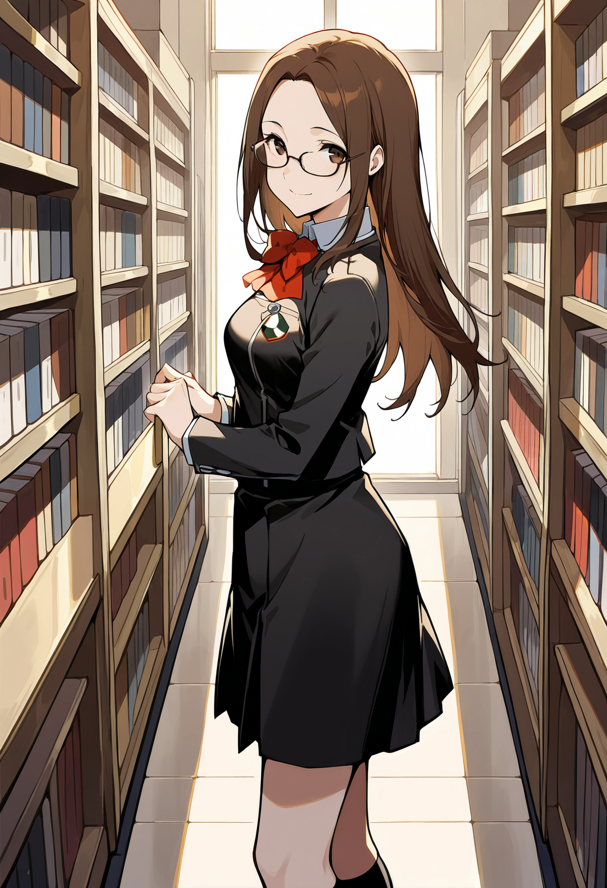 p3chihiro-winuni, school uniform, gekkoukan high school uniform, bow, bowtie, red bow, jacket, black jacket, long sleeves, skirt, black skirt, socks, kneehighs,