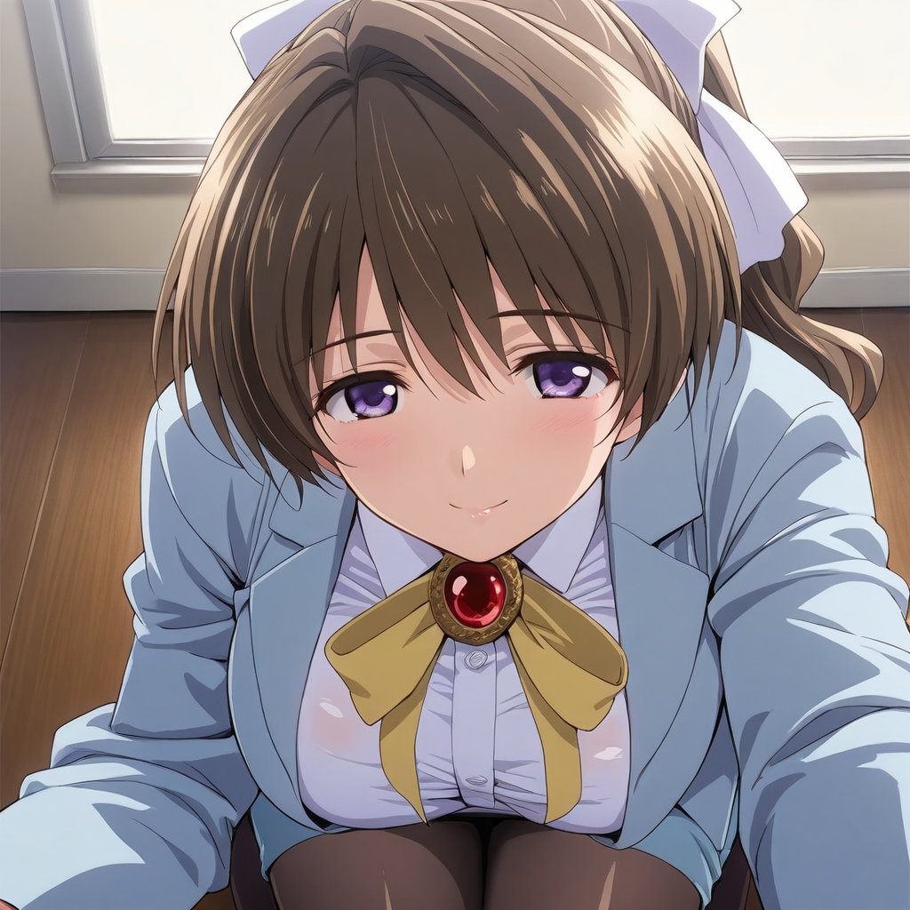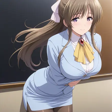 교사 복장: haruka, 갈색 머리, 플랫테일, 보라색 눈, 흰색 머리끈, 노란색 가슴 리본, 빨간 버튼, 흰색 블라우스, 연파란색 정장 재킷, 연파란색 치마, 팬티스타킹,