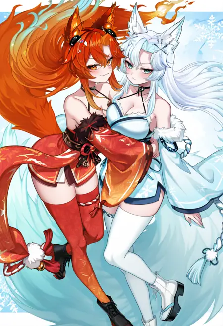 | 训练词汇 | smugalana, 1girl, solo, fox girl, orange hair, red hair, multicolored hair, gradient hair, long hair, hair between eyes, orange eyes, breasts, large breasts, cleavage, collarbone, blush, animal ears, fox ears, animal ear fluff, tail, fox tail, flame-tipped tail, orange tail, japanese clothes, kimono, short kimono, red kimono, dress, halter dress, detached sleeves, wide sleeves, long sleeves, sash, obi, halterneck, criss-cross halter, rope, thigh strap, fire, fiery hair, bell, bare shoulders, sandals, okobo, black footwear, 已复制! smugalana, 1girl, solo, fox girl, blue hair, light blue hair, white hair, multicolored hair, streaked hair, long hair, hair between eyes, blue eyes, breasts, large breasts, cleavage, collarbone, blush, animal ears, fox ears, animal ear fluff, tail, fox tail, japanese clothes, kimono, short kimono, blue kimono, thighhighs, white thighhighs, zettai ryouiki, choker, black choker, detached sleeves, wide sleeves, long sleeves, sash, obi, fur trim, bare shoulders, hair ornament, snowflake hair ornament, pom pom (clothes), blue nails, boots, white footwear, cross-laced footwear, 已复制! |