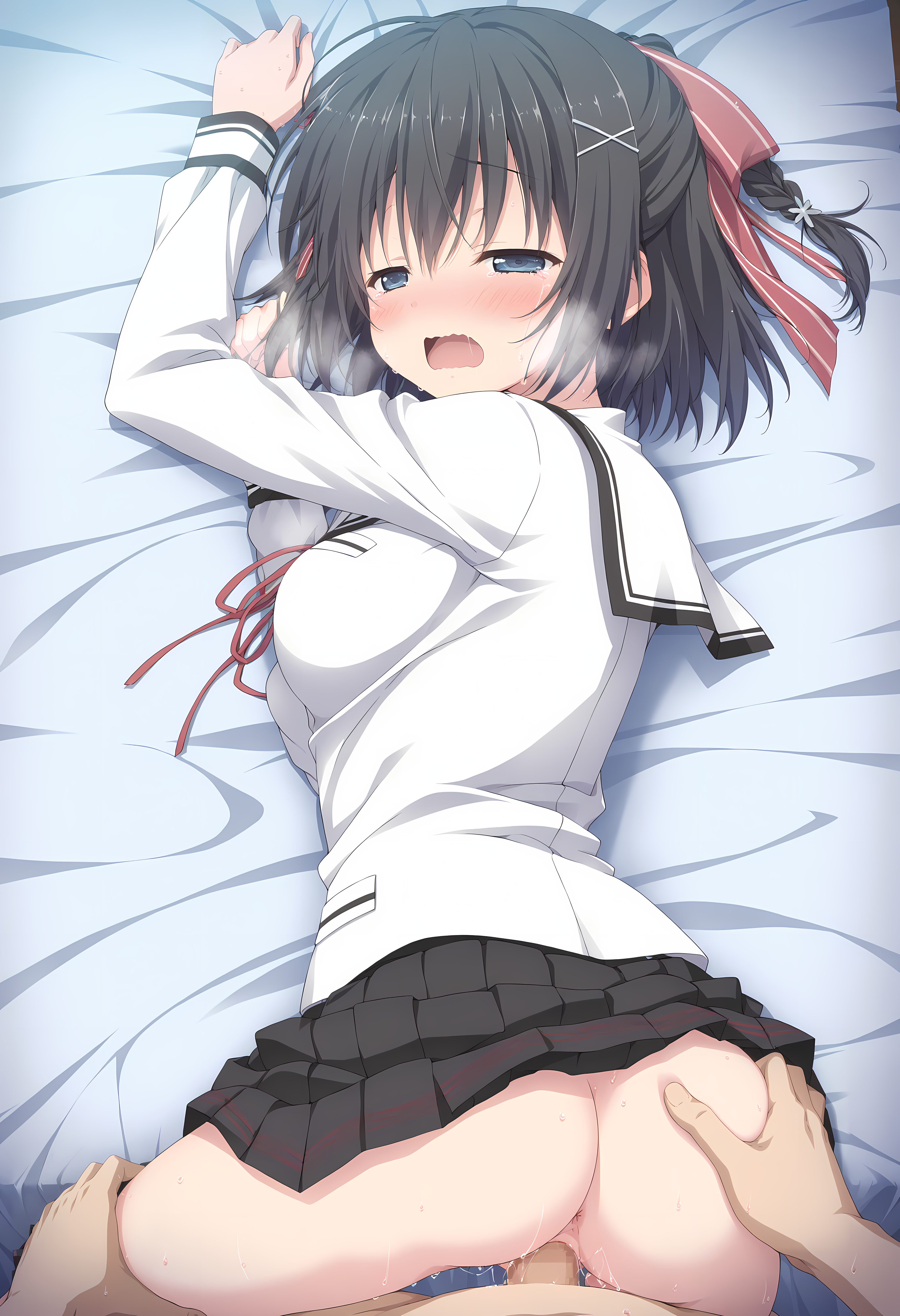 베이스: 코노미, 파란 눈, 중간 사이즈 가슴, 앞머리, 검은 머리, 단발, 머리 장식, 머리 리본, x 머리 장식, 머리 리본, 빨간 리본