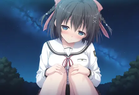 코노미 앨터(앨터라고 했지만, 이건 타임스킵 전의 그녀입니다): 코노미, 긴 머리, 파란 눈, 앞머리, 중간 사이즈 가슴, 검은 머리, 머리 장식, 머리 리본, x 머리 장식, 머리 리본, 앨터 코노미, 터틀넥, 검은 팬티스타킹, 흰 리본