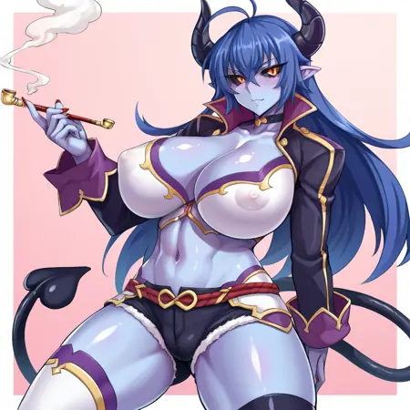 | 训练词汇 | shinrabanshou_asmodeus, 1girl, solo, black sclera, breasts, colored sclera, horns, blue skin, colored skin, demon girl, tail, blue hair, yellow eyes, pointy ears, huge breasts, long hair, demon tail, cleavage, navel, covered nipples, demon horns, choker, black jacket, thighhighs, asymmetrical clothes, midriff ,no wings已复制! kiseru , smoking pipe已复制! |