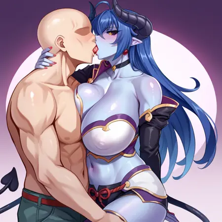 | トレーニングワード | shinrabanshou_asmodeus, 1girl, solo, black sclera, breasts, colored sclera, horns, blue skin, colored skin, demon girl, tail, blue hair, yellow eyes, pointy ears, huge breasts, long hair, demon tail, cleavage, navel, covered nipples, demon horns, choker, black jacket, thighhighs, asymmetrical clothes, midriff ,no wingsコピーしました! kiseru , smoking pipeコピーしました! |