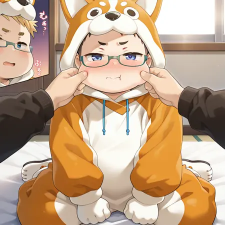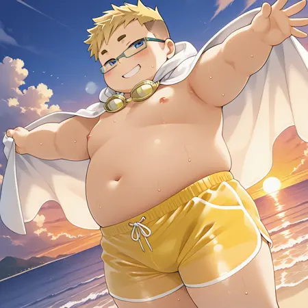 Negative prompt: bad quality, worst quality, worst detail, normal quality, sketch, censor, censored, bar censor, multicolored theme, simple background, pectorals, fake pectorals, bad anatomy, bara, muscular, muscle, (big belly), (obese), extra_eyebrow, low angle, clone, duplicate, bad_mouth, fewer digits, bad_hands, (long_shot), collared_shirt, painted lips, pink lips, deformed, :o, sweatdrop, breasts, tits, cropped torso, bulge, navel, shota, child, adjusting_eyewear