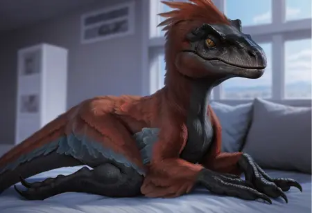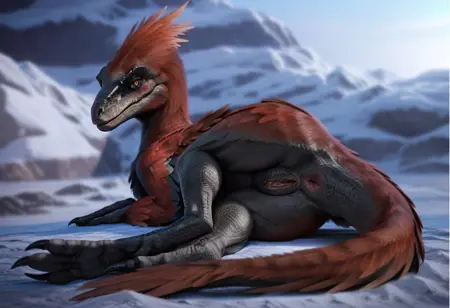 pyroraptor, dinosaur, red feathers, gray skin, claws, yellow eye, leg raptor
