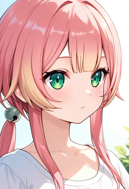 pink hair,blonde hair,multicolored hair, gradient hair,ponytail with jingle bells,ahoge