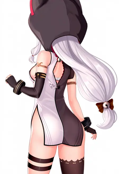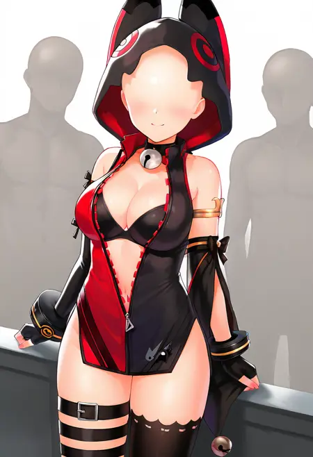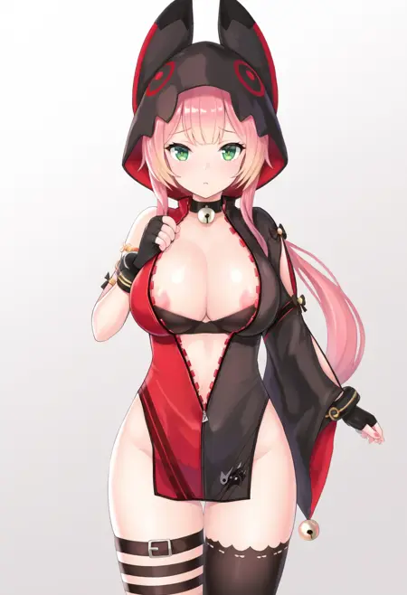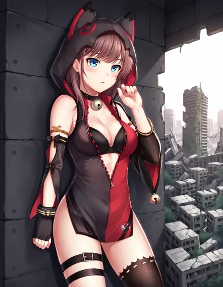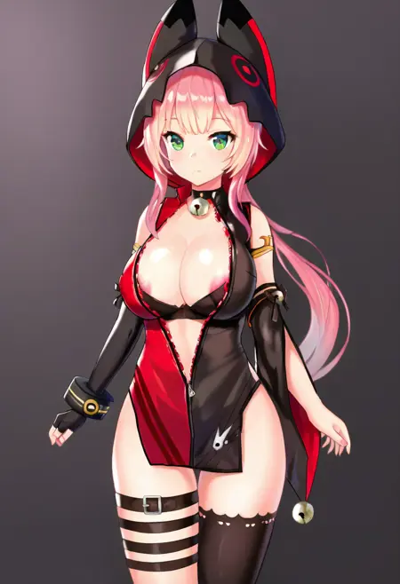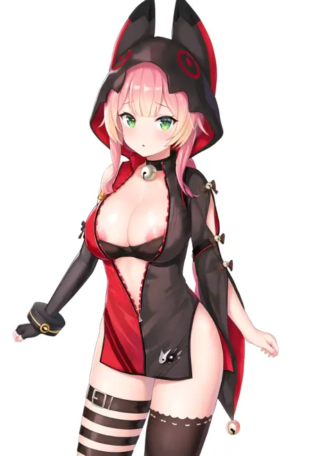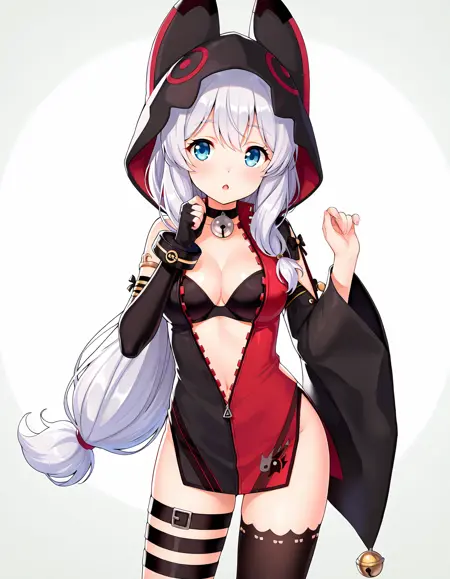 動物のフード、部分的にジッパーが開いている、片方の太ももハイ、太ももストラップ、黒いブラ、赤いドレス、黒いドレス、多色のドレス、片方の肘まで開いた手袋、ブレスレット、ゴールドの縁取り、片方のカットアウト袖、袖のリボン、袖の鈴、広い袖、ネックベル、リンリンベル、