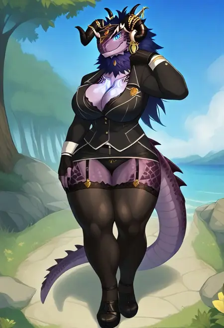 score_9, score_8_up, score_7_up, score_6_up, score_5_up, score_4_up, masterpiece, high quality,1girl,Onasha-Maki,argonian,purple scales,colored skin,scales,thighs,seductive smile, blue eyes,colored skin,purple skin,thighhighs,black thighhighs,cleavage,large breasts,cleavage,jewelry,tail,long tail,horns,Dragon Horns,black horns,dragon tail,horn ornament,tattoo,back tattoo,furry female,muscular body,abs,light glowing eyes,tall female