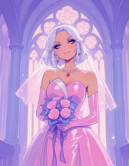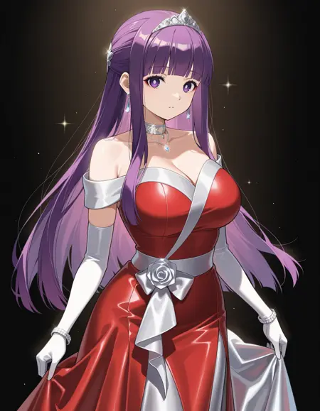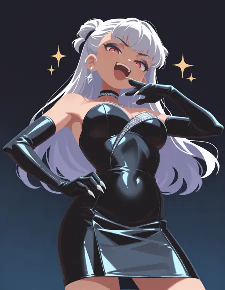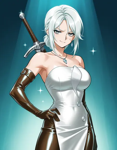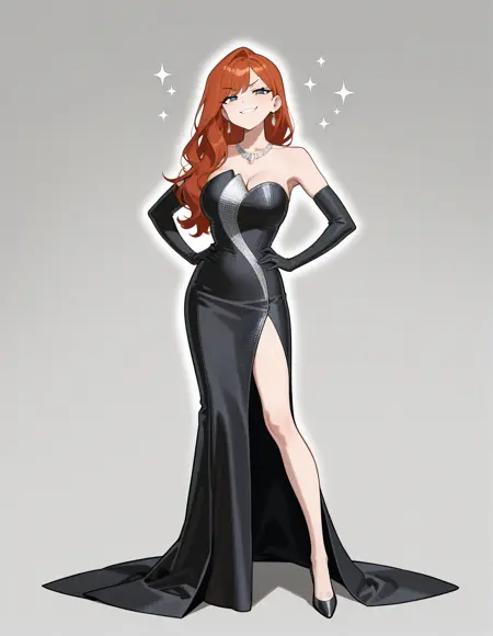 无肩带连衣裙,缎面<颜色>连衣裙,落肩设计,银色装饰,不对称装饰,闪亮点缀,及肘手套,钻石手链,钻石项圈,耳环