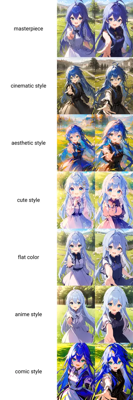 我在部分训练图像中加入了风格标签。在提示中描述这些标签,可实现多种效果。此外,将风格标签插入负向提示或组合使用,可生成符合你想象的图像。