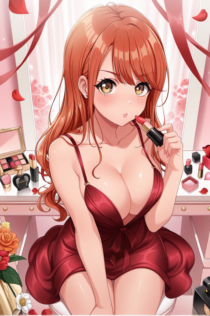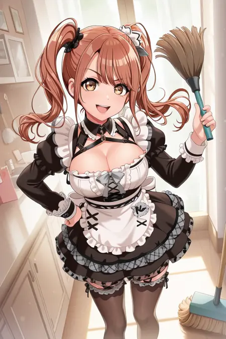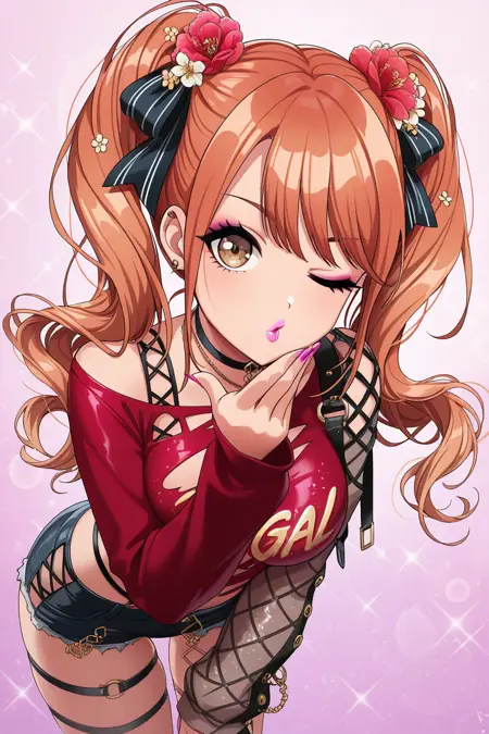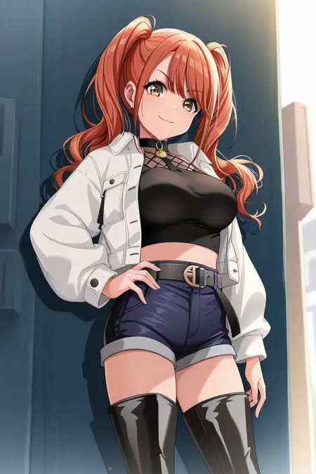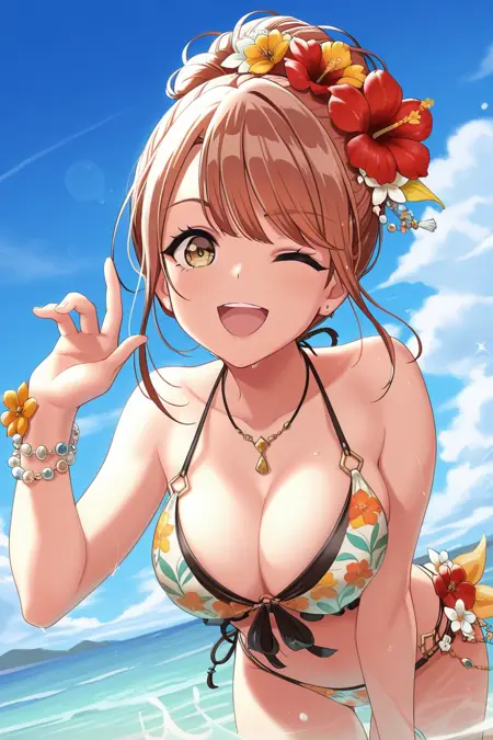 rika, 1girl, eyewear on head, sunglasses, solo, shorts, flower, jewelry, smile, open mouth, yellow flower, hair ornament, hair flower, twintails, denim shorts, breasts, stage outfit, on stage