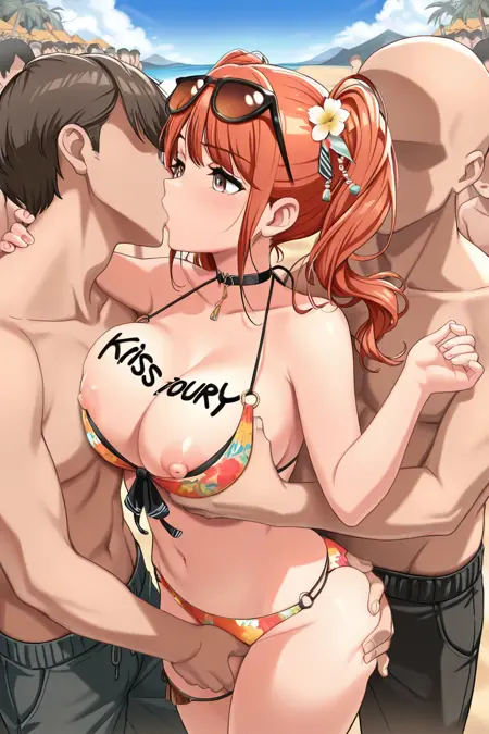 rika, 1girl, breasts, eyewear on head, swimsuit, twintails, bikini, smile, sunglasses, solo, cleavage, large breasts, looking at viewer, v, navel