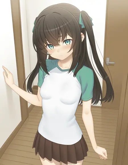 shino(Kyoudai_no_Jouji_Jijou), 1girl,solo, black hair,long hair, hair ribbon, aqua ribbon, twintails, green eyes, small breasts, bangs,