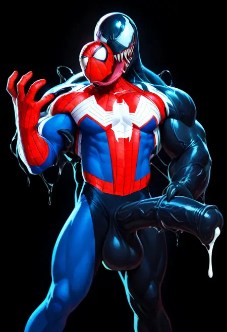 독액에 감염된 스파이더맨: Venom, black body, white markings, long tongue, body suit, Spider-Man, merging, absorption, corruption