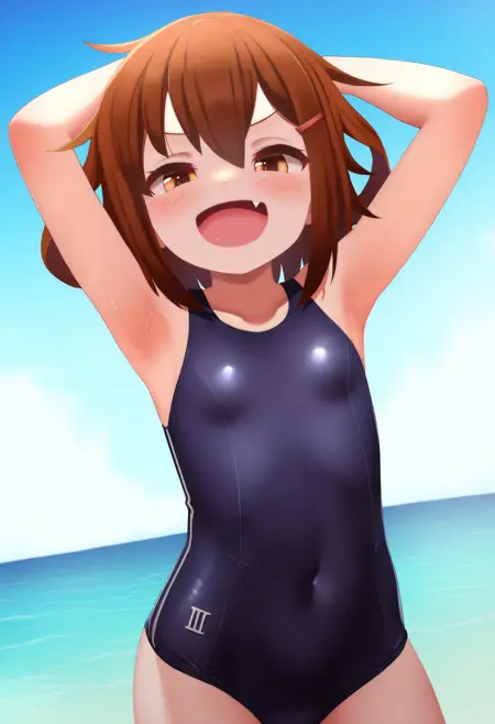 基础提示词:1girl, ikazuchi \(kancolle\), brown hair, short hair, brown eyes, hairclip, fang