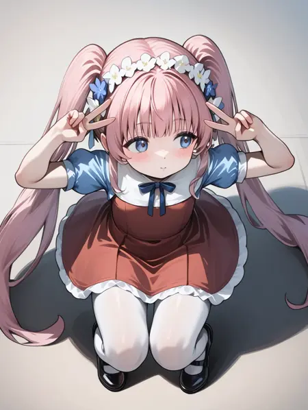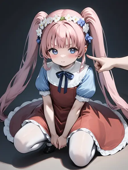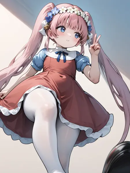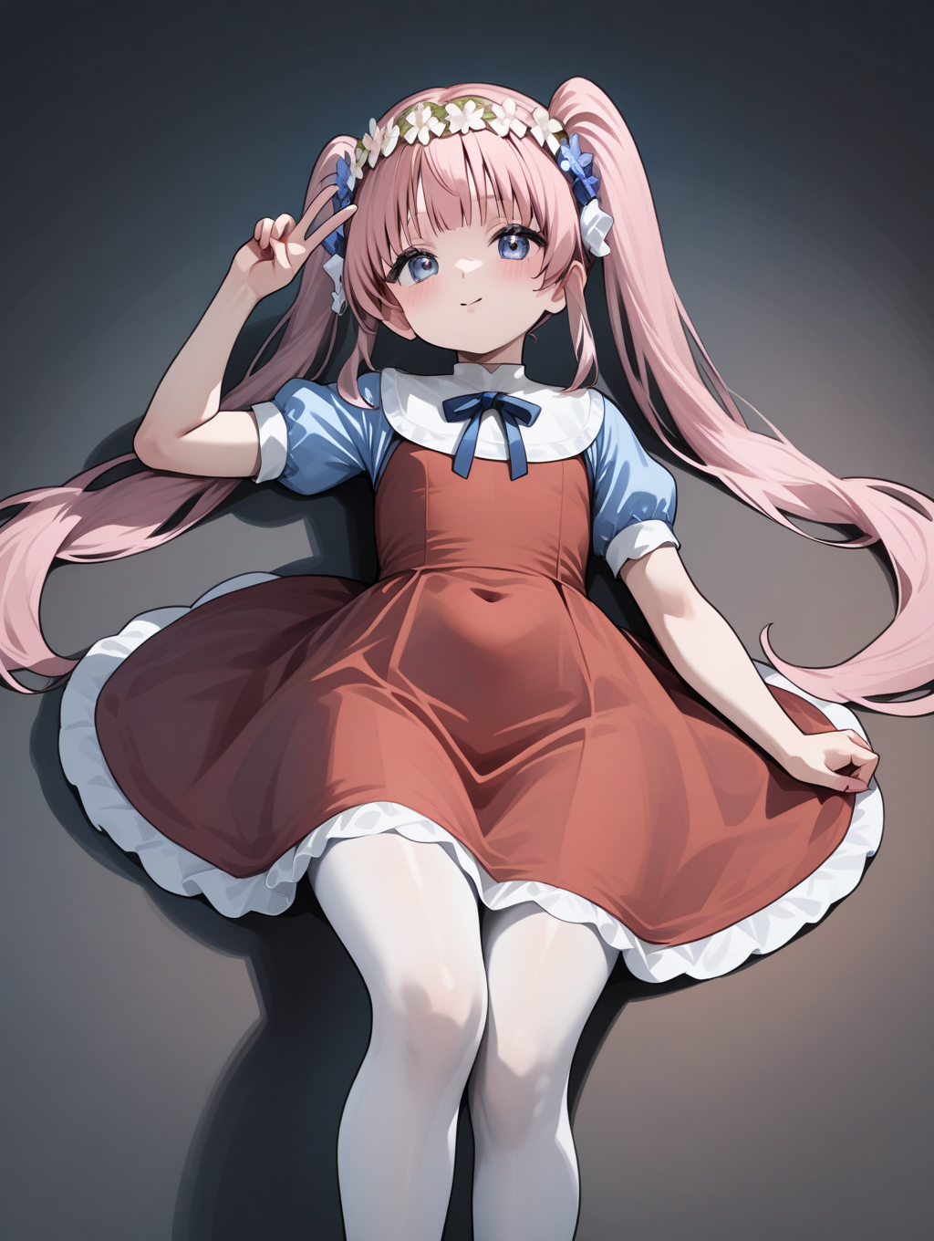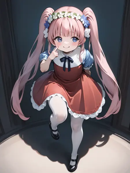 prompt example :ereonora,pink hair,twintails,hair ornament,head wreath,red frilled dress,puffy short sleeves,white pantyhose,