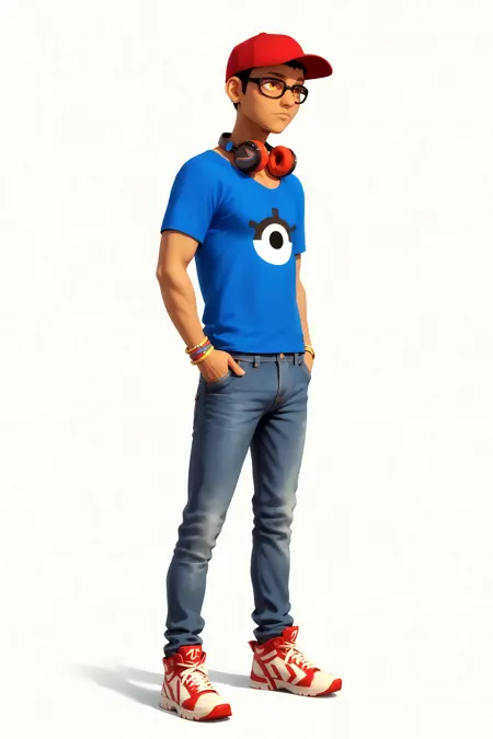 衣装プロンプト:hat, baseball cap, headphones around neck, glasses, black-framed eyewear, blue shirt, pants, jeans, denim, sneakers, bracelet