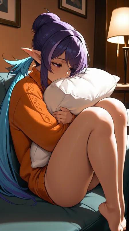 purple hair, long twintails, blue twintails, purple eyes, pointy ears, elf ears, white top, short sleeves, cleavage, medium breasts, blue crop top, midriff, white gloves, blue cufflinks, blue and white skirt, multicolored skirt, straps,
