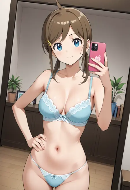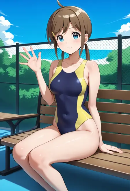 outfit1aaizumi, brown hair, low twintails, ahoge, hair ornament, hairclip, blue eyes, breasts, competition swimsuit