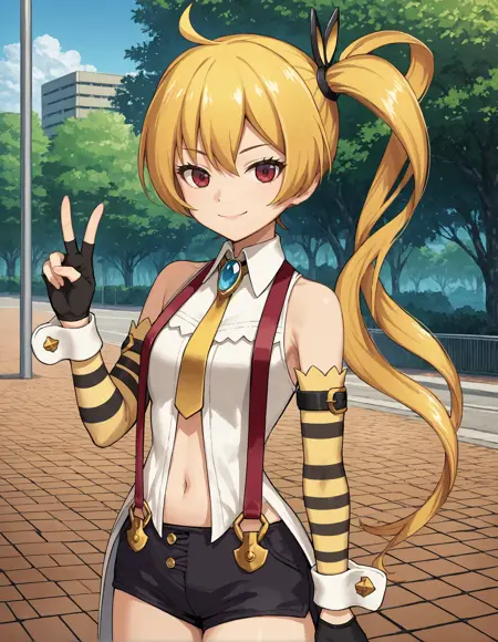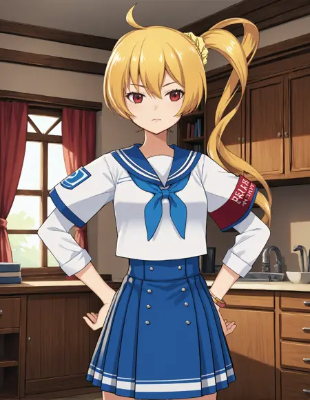 Appearance: blonde hair, ahoge, side ponytail, red eyes