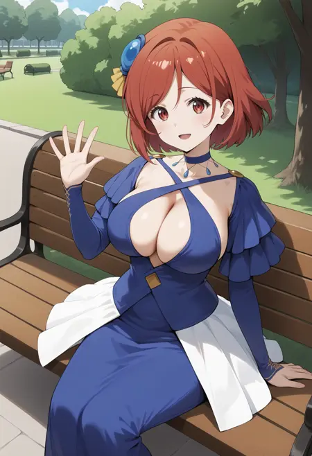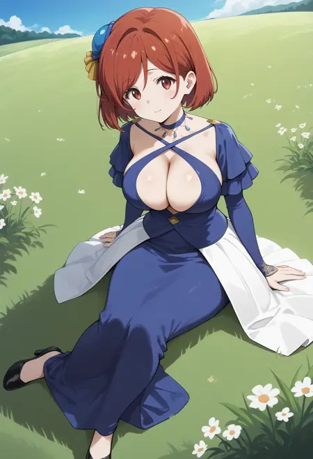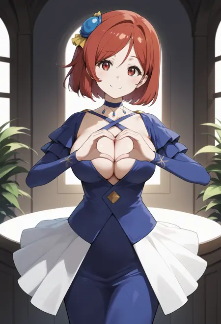outfit1aaariadoa, short hair, red hair, hair ornament, red eyes, large breasts, blue choker, criss-cross halter, cleavage, long dress, blue dress, long sleeves, white skirt