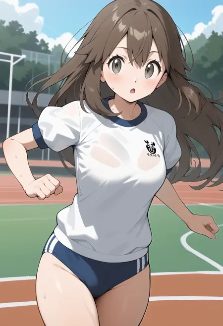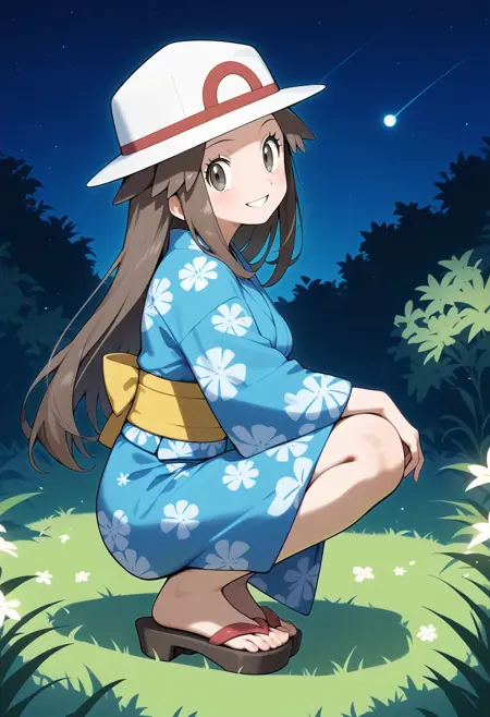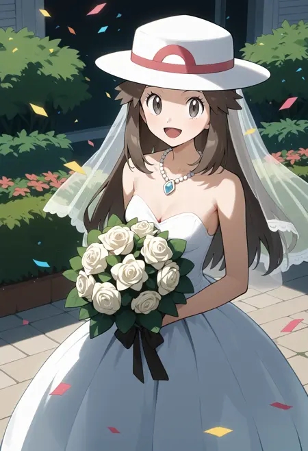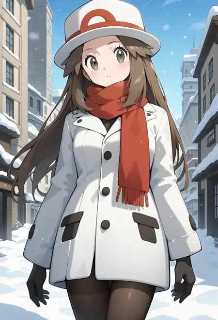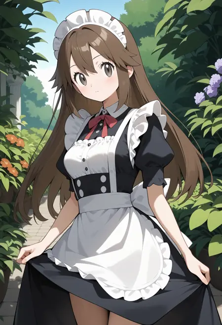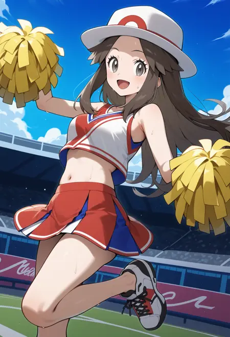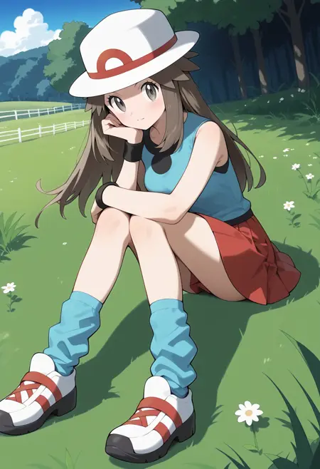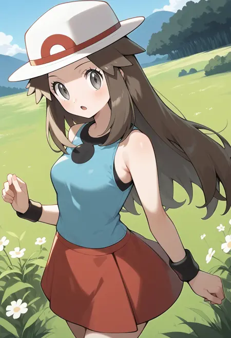 outfit1aaleaf, long hair, brown hair, porkpie hat, white headwear, grey eyes, breasts, blue shirt, sleeveless, black wristband, miniskirt, red skirt