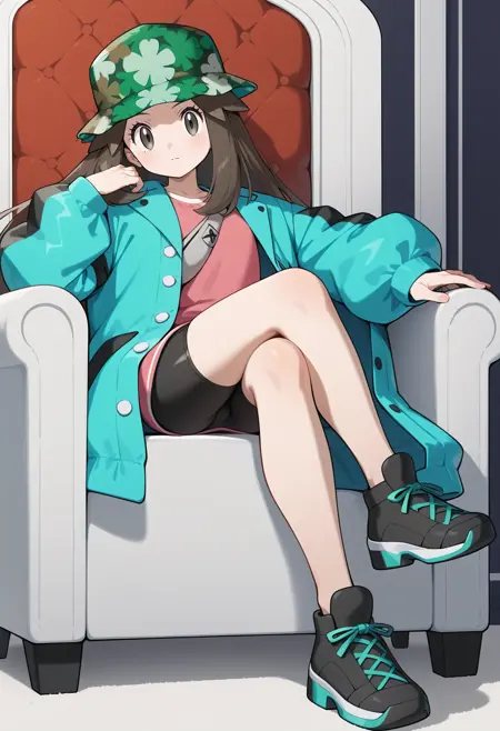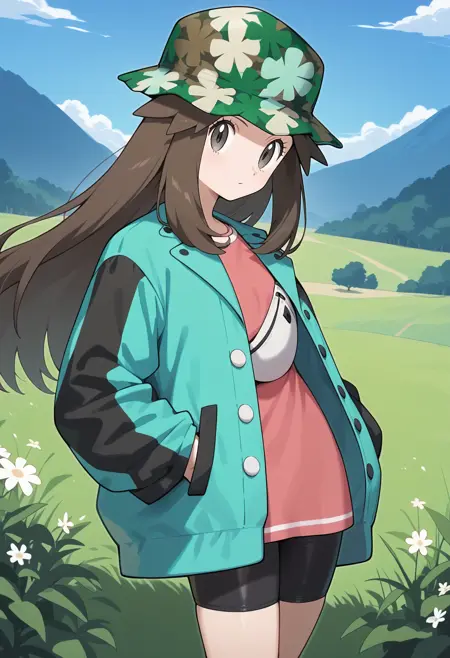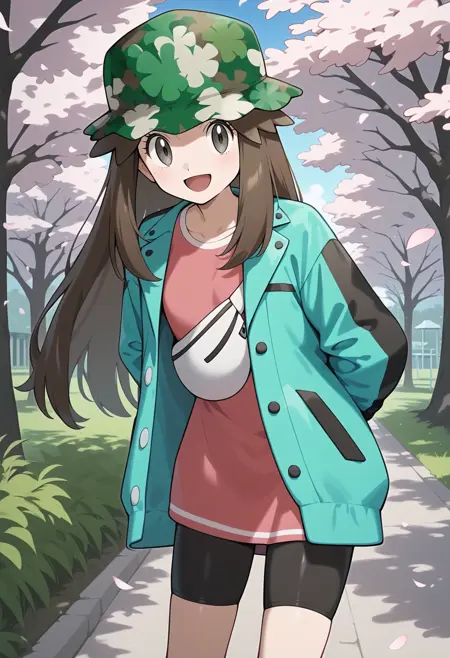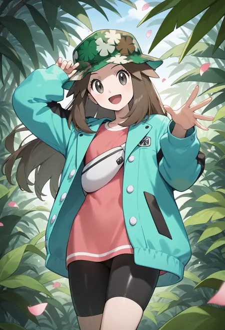 outfit2aaleaf, long hair, brown hair, hat, camouflage headwear, green headwear, grey eyes, pink shirt, aqua jacket, open jacket, fanny pack, long sleeves, buttons, bike shorts