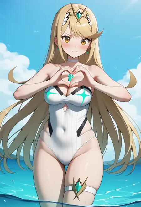 outfit4 (hikari)aahikari, long hair, blonde hair, swept bangs, earrings, yellow eyes, breasts, jewelry, choker, cleavage, bare shoulders, strapless swimsuit, white one-piece swimsuit, thigh strap