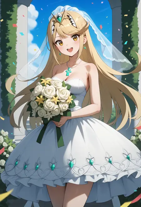 outfit2 (hikari)aahikari, long hair, blonde hair, tiara, swept bangs, earrings, yellow eyes, breasts, jewelry, cleavage cutout, armored dress, short dress, white dress, elbow gloves, white gloves, thigh strap, bare legs
