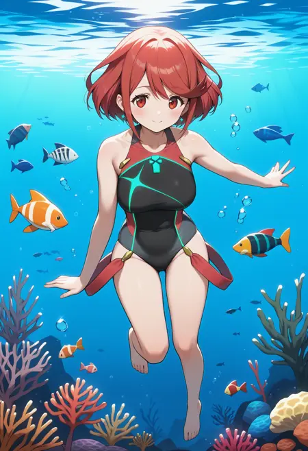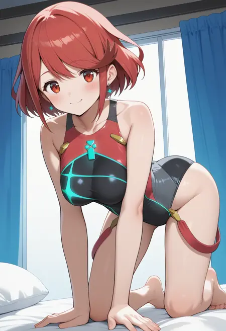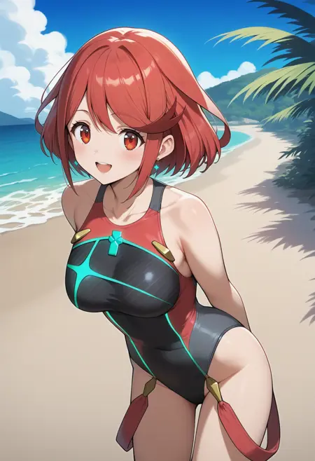 outfit3 (homura)aahomura, short hair, red hair, swept bangs, earrings, red eyes, breasts, collarbone, competition swimsuit, black one-piece swimsuit, suspenders hanging