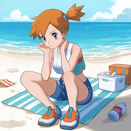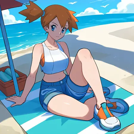 lgpemisty, orange_hair, side_ponytail, blue_eyes, white_crop_top, denim_shorts, shoes