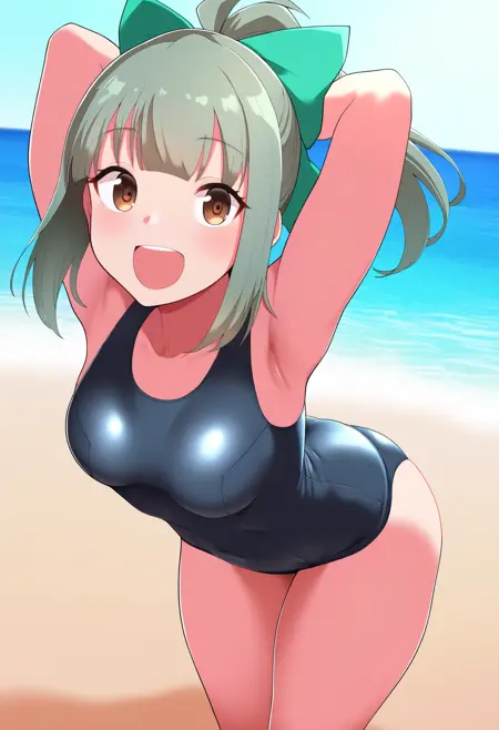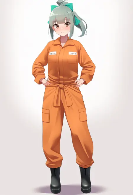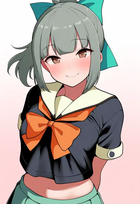 기본 프롬프트: 1girl, yuubari \(kancolle\), grey hair, ponytail, bangs, brown eyes, green hair bow