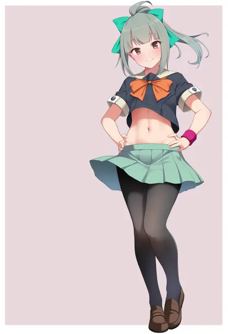 교복 프롬프트: orange bowtie, pleated green skirt, sailor collar, school uniform, midriff, navel, serafuku, short sleeves, wristband, black pantyhose
