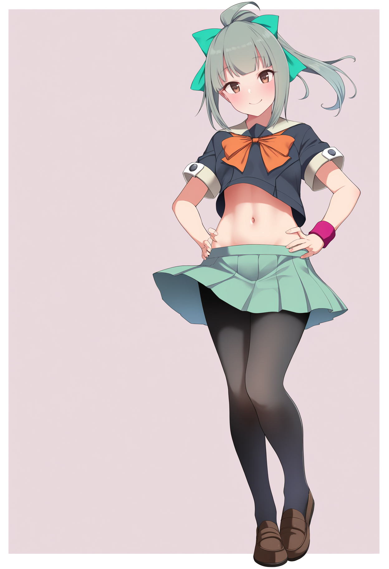 School uniform prompts : orange bowtie, pleated green skirt, sailor collar, school uniform, midriff, navel, serafuku, short sleeves, wristband, black pantyhose
