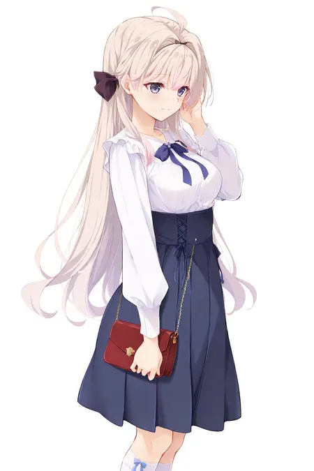 Noekacasual, white blouse, long sleeves, blue skirt, high-waist_skirt, pleated skirt, white socks, black_footwear, bow