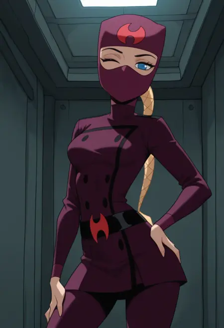 -HuntsgirlS2, Dark Purple Mask, Blue Eyes, Blonde Hair, Braided Ponytail, Low Ponytail, Dark Purple Uniform, Belt