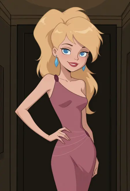 -RoseS2SDXL, Human Female, Blue Eyes, Blonde Hair, Lipstick, White T-shirt, Sleeveless, Necklace, Earrings, Midriff, Belt, Pink Jeans, Sandals