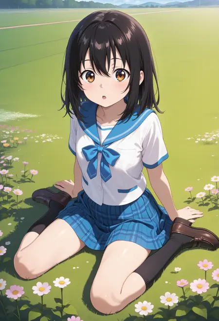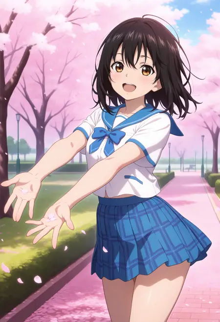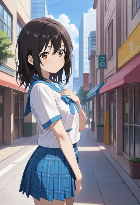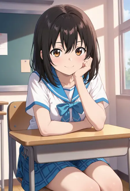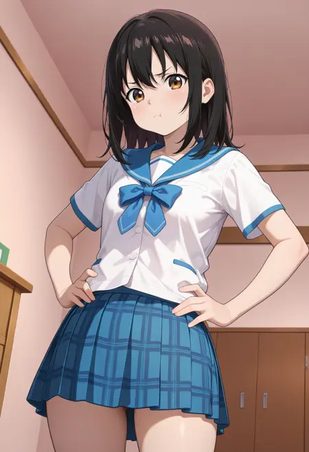 aayukina, medium hair, black hair, brown eyes, school uniform, blue sailor collar, blue bow, white shirt, short sleeves, plaid skirt, blue skirt